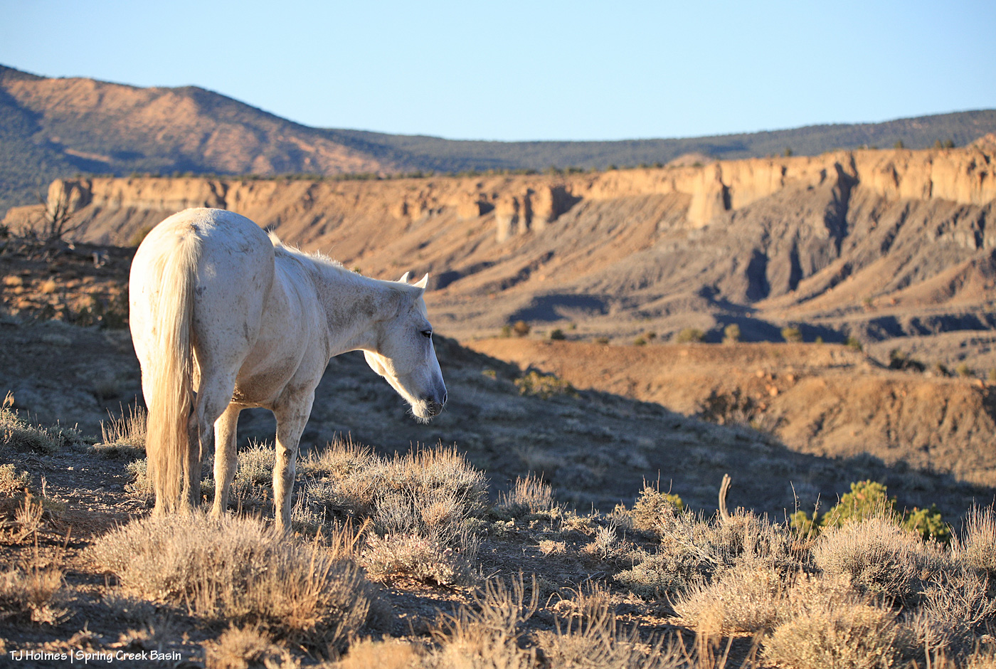 Mysterium contemplates … something? … while grazing with her band in the still-muddy eastern part of Spring Creek Basin. Spring Creek is still trickling, and the horses had been drinking there before making their way up this ridge.