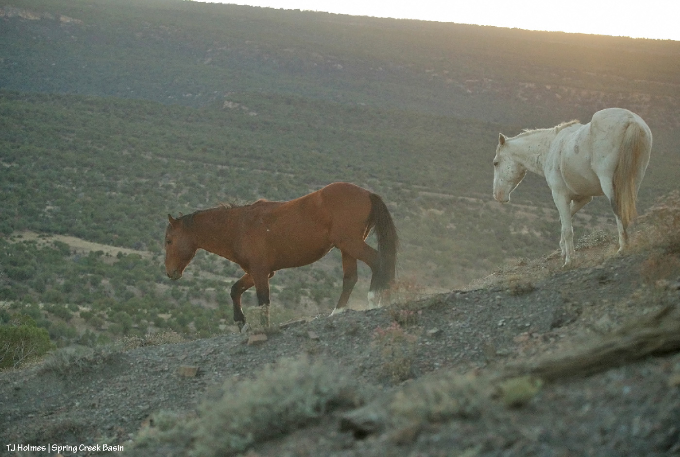 Tenaz and Skywalker make their way down a hill at sunset to one of Spring Creek Basin’s water catchments, now holding plenty of water after the rains a week ago.