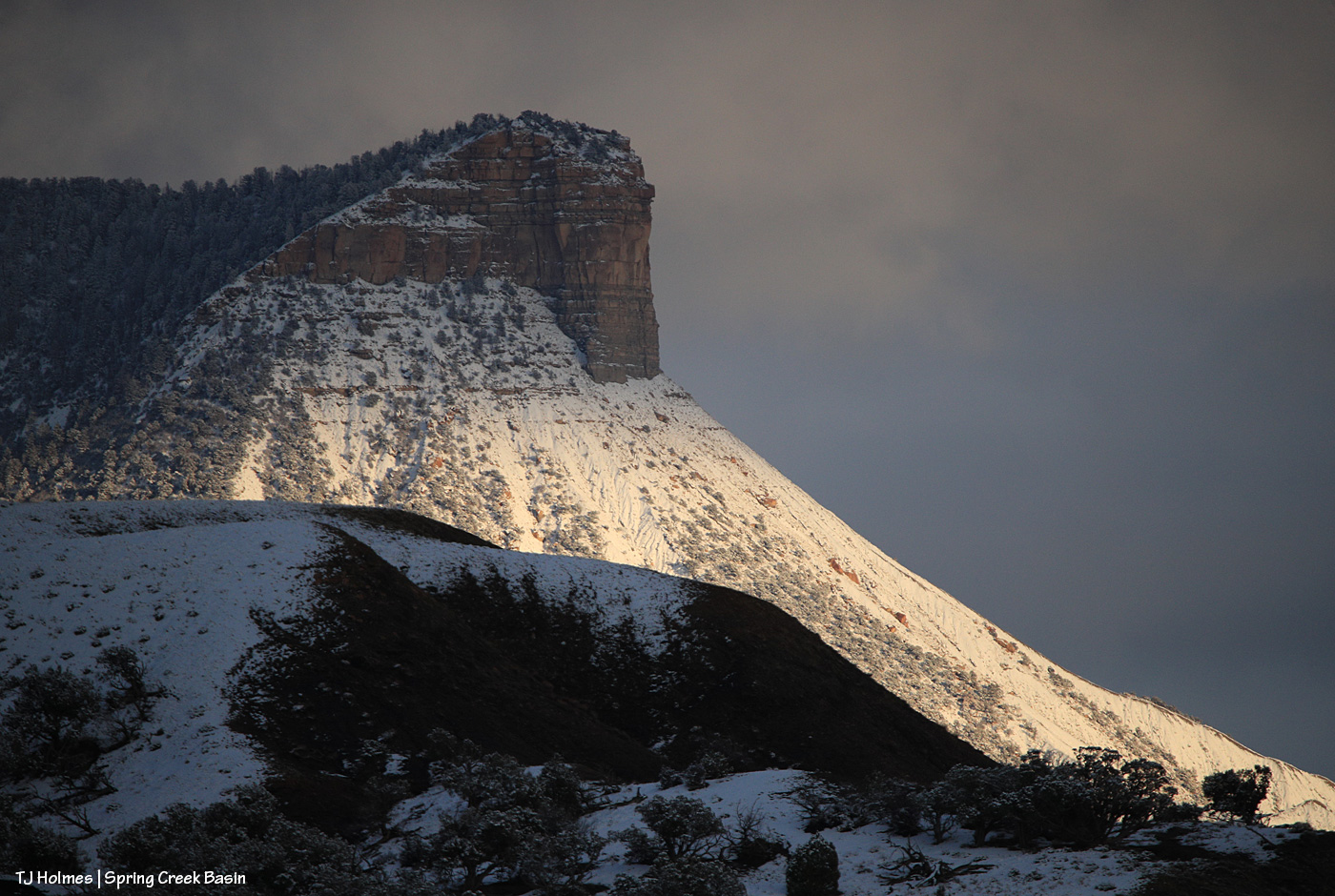 And just a few/several minutes later (less than 10 minutes later from my image files’ info), from down the hill and back at my buggy … the above scene. The sun found a last-minute sneak-peak hole in the clouds to light up the lower slopes of Temple Butte. Just … kinda … wow. π