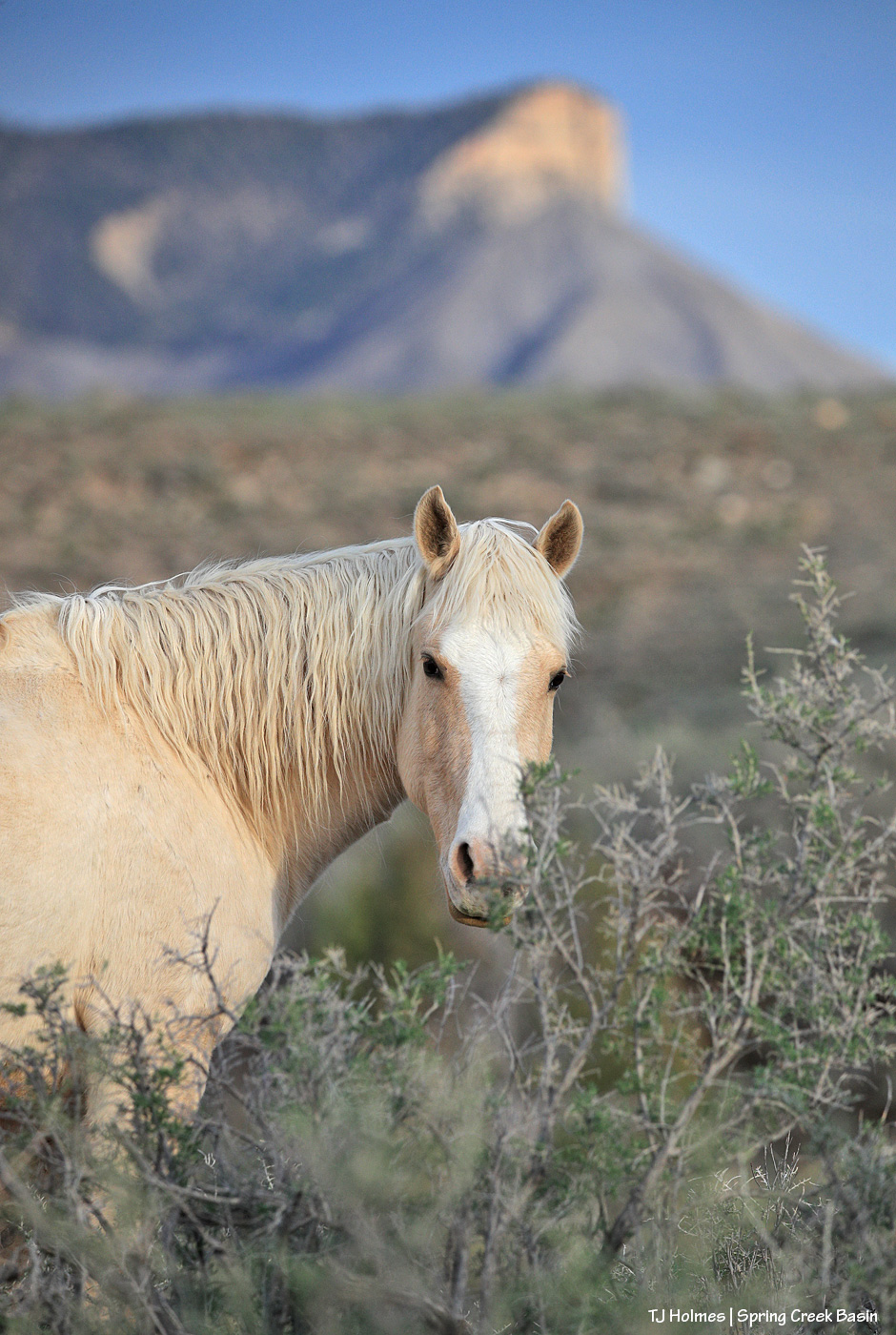 Pretty palomino girl Rowan in the very-green budding greasewood. The mustangs LOVE greasewood, and I have to think there’s no better taste (palatability?) than when it’s first budding and yummy after a long season of it being just a woody shrub.