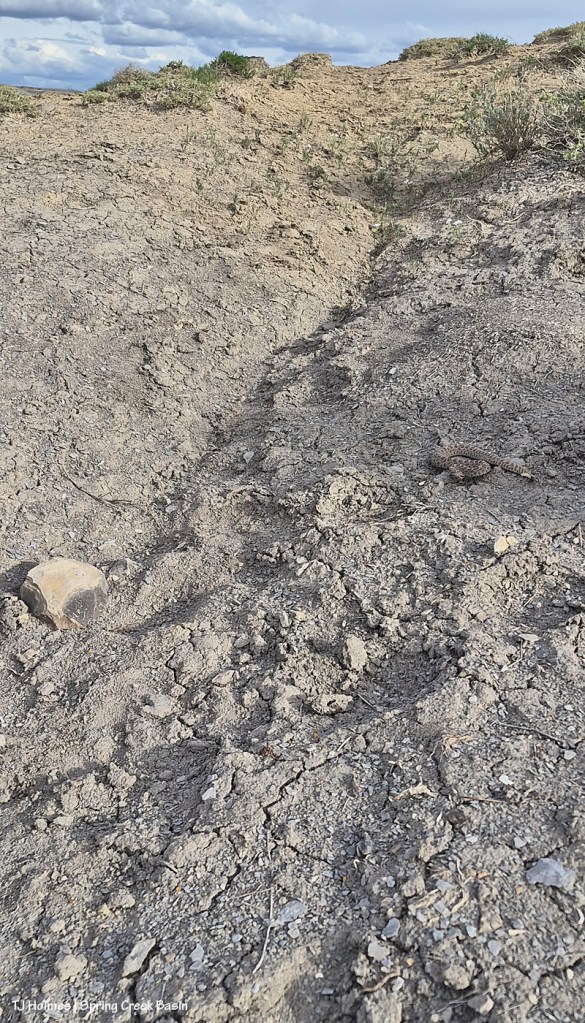 It took a moment for the sound to reach my ears, to reach my brain, for my brain to process it, for me to stop my thoughts-elsewhere forward rush and to look back at the bush (small, a four-wing saltbush, maybe) I’d just passed. Was it entwined around the base? Uh, no. Then I spotted it. (I think I’ve written enough to warn you if you’re at all snake-squeamish??)