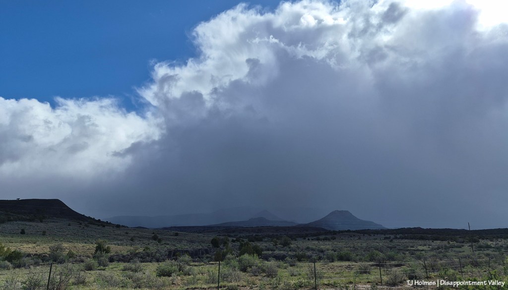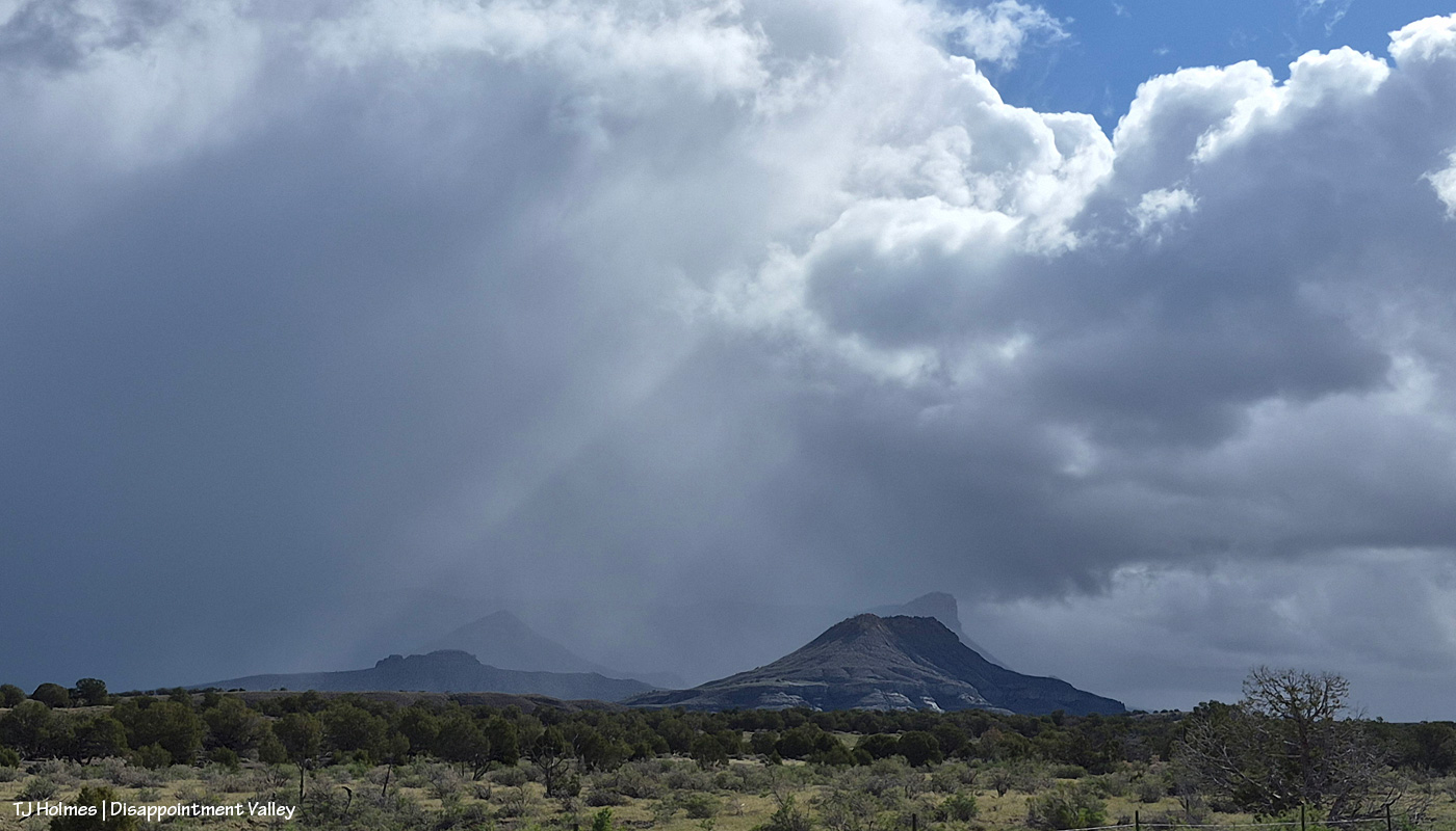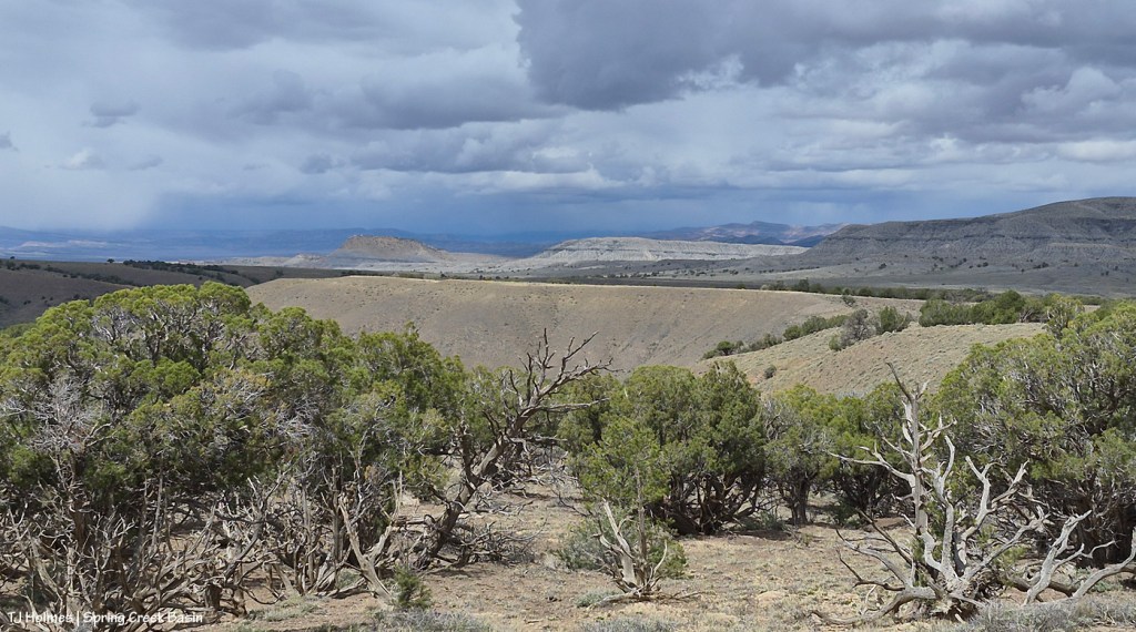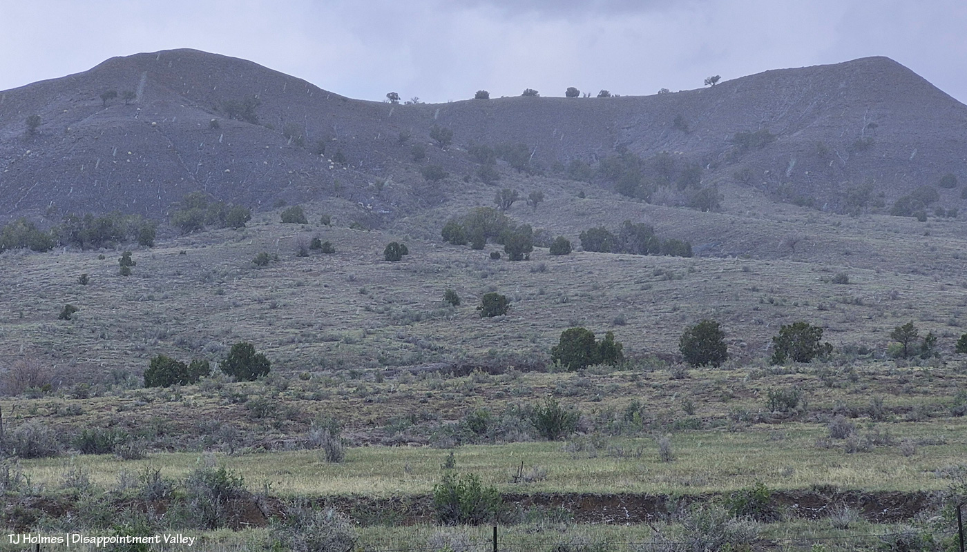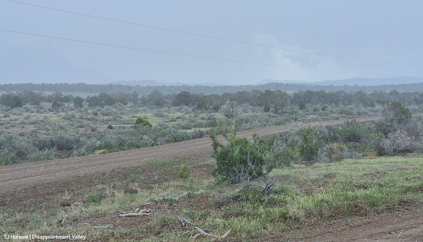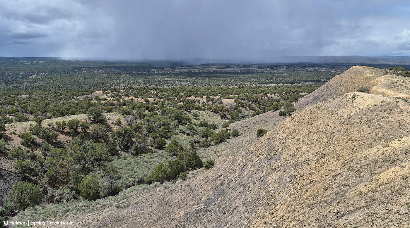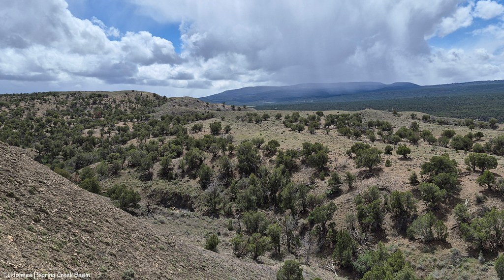 The reason you can’t see Utah’s La Sal Mountains in this pic – way northwest of Spring Creek Basin, from the very far southeastern part of Spring Creek Basin – is because the rain/graupel/snow wasn’t through sending waves over them. 🙂 You CAN see, from right to left, Round Top, Flat Top (looks sloping), Filly Peak and the south-facing rimrocks. Disappointment Road is over to the left somewhere (not far)