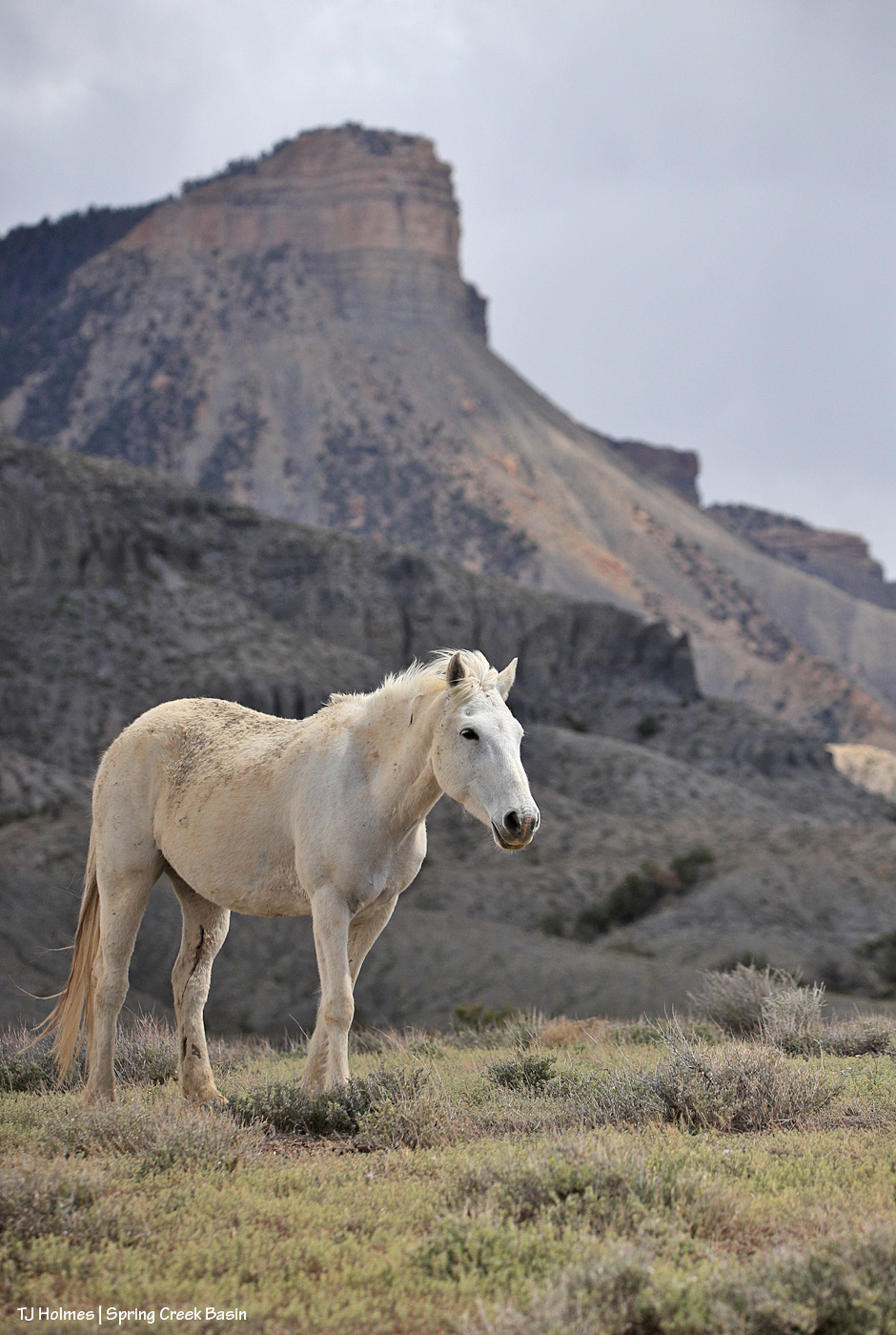 Mysterium, modeling her scruffy-chic look (fashion designers, take note – ha!) below Temple Butte. 🙂 Yes, those are a couple of cuts on the inside of her left hind leg, but she’ll heal quickly, as mustangs do!