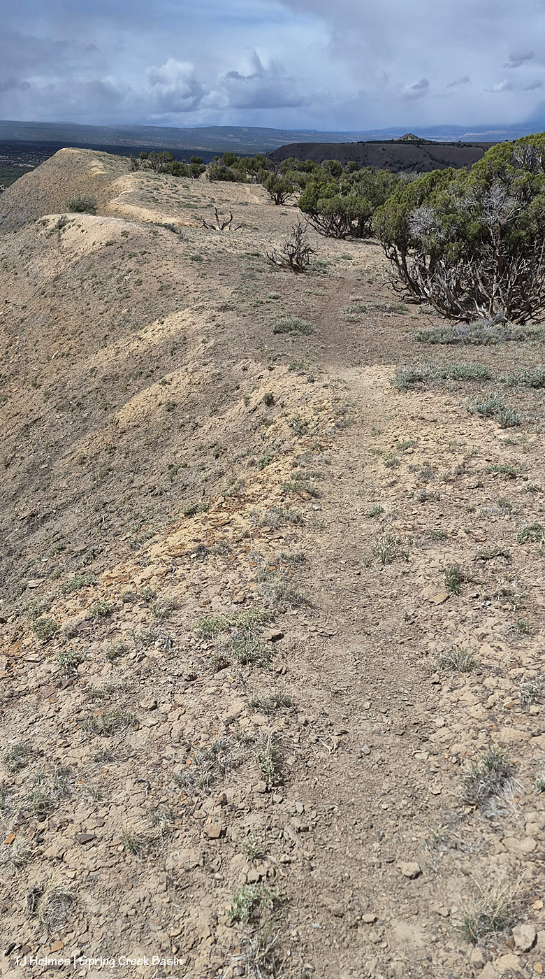 From the same spot now looking back to the south/southeast at another little rain/snow/graupel-fall, toward the Glade and Benchmark Lookout (hi, Rick and Linda! (I think they’re not at the fire lookout tower quite yet)). The near hills and pinon-juniper are all within Spring Creek Basin. The far, thickly treed ridges are partly (middle-ish ground) part of upper Disappointment Valley and partly (farther) part of San Juan National Forest lands beyond Disappointment Valley and its watershed.
