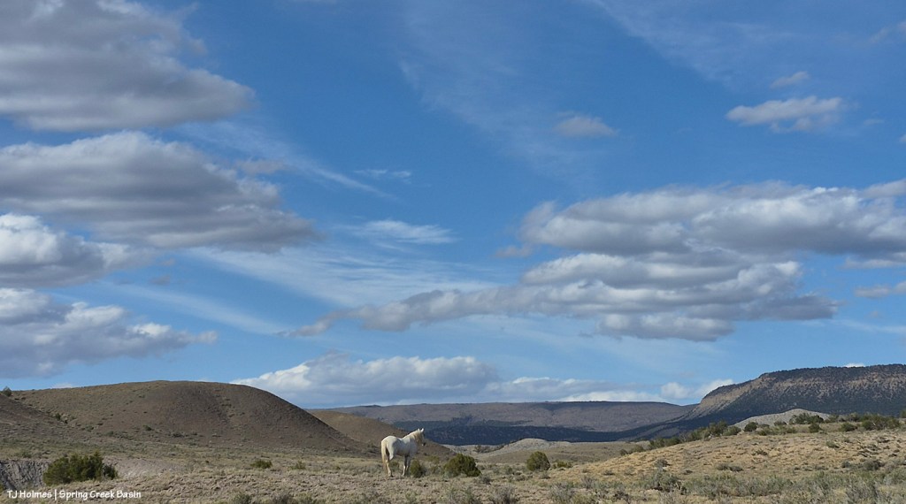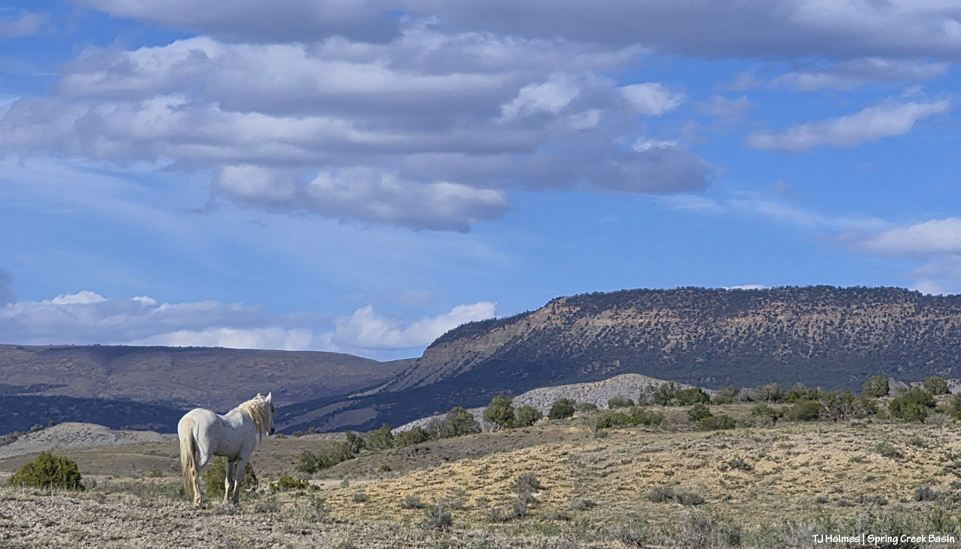 Flash’s band is behind him, to the left. He was focused in the direction he’s looking. … Even when they moved up the hill to the left, grazing as they went, he continued to look in that direction. I went higher … and looked and looked. I couldn’t see any other horses, or a coyote, or anything. He was calm, but every now and then, he’d look back in that direction. Eventually (20 minutes later?), sure enough, a bachelor appeared from around the hill in the distance. The wild ones know!