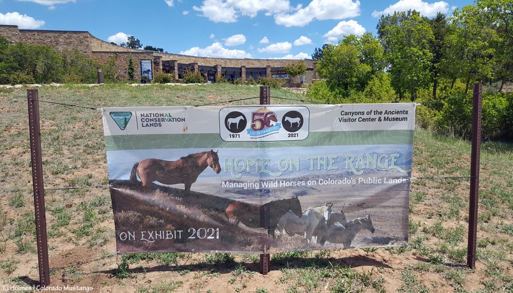 On the heels of this week’s feel-good good-news stories, here’s another one to end your week on a high: Through the end of the year, Canyons of the Ancients Visitor Center and Museum (formerly called Anasazi Heritage Center) will host “Home on the Range: Managing Wild Horses on Colorado’s Public Lands,” an exhibit to celebrate the 50th anniversary of the Wild Free-Roaming Horses and Burros Act. Images and information about Colorado’s three herd management areas (Spring Creek Basin, Sand Wash Basin and Piceance-East Douglas) and one wild horse range (Little Book Cliffs) are included in the exhibit, as well as an adopters corner, which highlights a few awesome adopters of some of Spring Creek Basin’s awesome mustangs with a poster and short video. (Thank you to Tif Rodriguez and Whisper, Keith Bean and Skipper, Alice Billings and Liberty, Steve and Teresa Irick and Breeze and Sage, and Olivia Winter Holm and Ellie!)