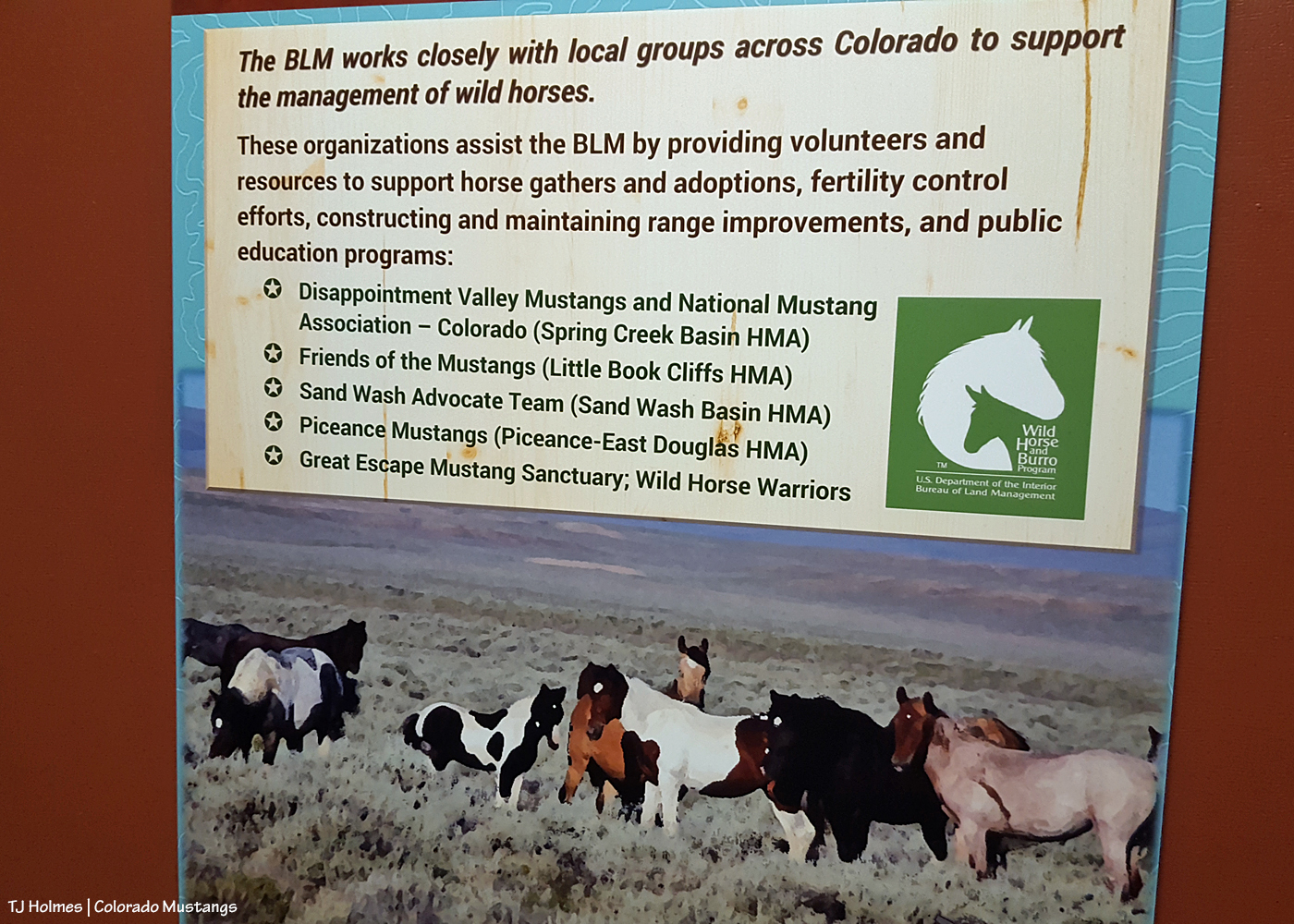 The exhibit also pays tribute to Colorado’s mustang advocacy groups – at least one for each herd in the state! Our mustangs are blessed to have people involved in every aspect of their observation and management (of course, we advocates know that WE are the blessed ones!).