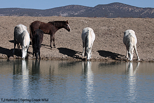 29 03 2013Grey/Traveler, center, drinks from a pond with his band, from left: Alegre, Maia, Mariah and Houdini. Water is the most precious resource of all in this high desert region.