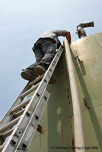 The storage tank is about 15 feet tall, so Cecil brings his ladder to access the hatch at the top. At right is the hose from his water truck.