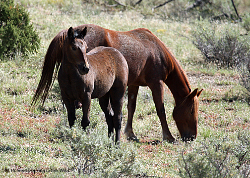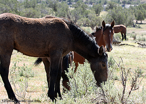 I finally left them to find Seven’s and see whether Mona had had her foal yet. The pilot had seen “the pregnant mare” and of course left her alone. (We did see Kreacher’s band before the roundup even started – they ran across what would later be “the observation hill” with SUNDANCE immediately behind them and Kreacher following (?!). Chrome broke away from his band to follow them … leaving his band separated for quite a while (they were later captured all together). People were camped farther north on that hill at the time … we didn’t see the horses again. I am very eager to find them.