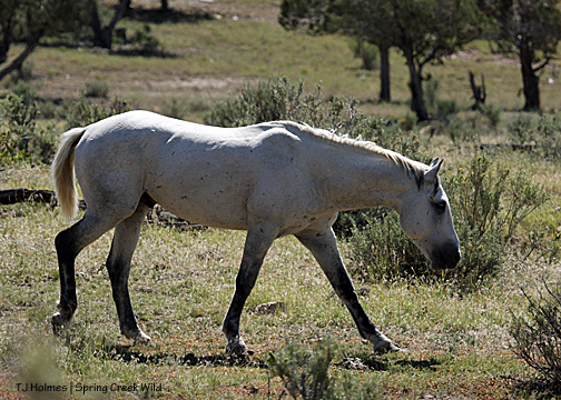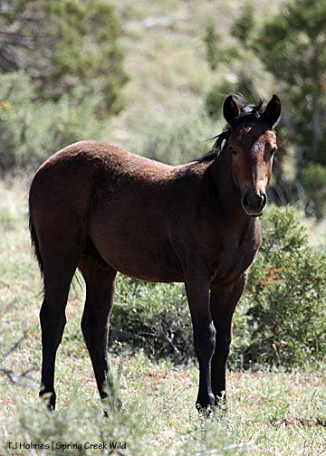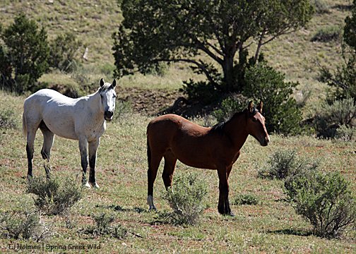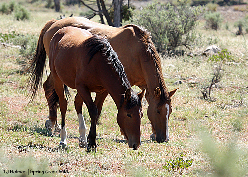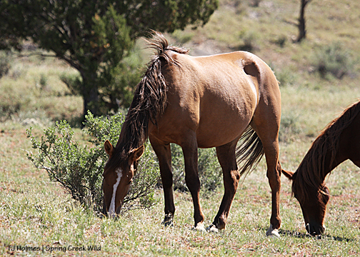 Tenaz and Corona. Tenaz was almost caught … Baylee was caught (she’s awaiting adoption – big, beautiful bay girl), and Storm gave observers a show when he galloped away right past them on the hill above the trapsite.