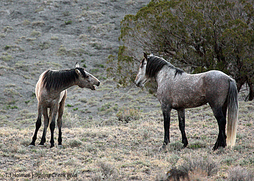 Changes happen all the time – that’s nature. Because foaling season and re-breeding season in horses happens one right after the other (no separate “rut” like with deer and elk) – and usually (but not always) in the spring – ’tis the season of changes. I like to focus on the behavior and all the “other” going on. So you’ll rarely see “fight shots” on this blog unless I can use them to illustrate the behavior behind it (such as the play fighting with the youngsters awhile back). Also, because images of stallions fighting are so prevalent, some folks then have the idea that the stallions just fight constantly, and that’s simply not the case. Stallions do fight to protect their mares and families – but they don’t fight all the time – and what else is going on?