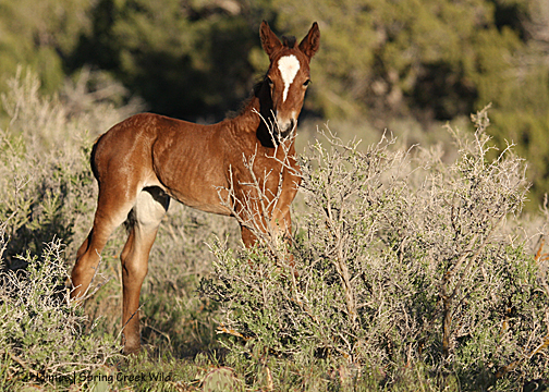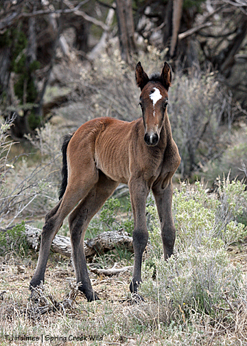 No name yet for this little girl, the daughter of Mahogany and Sundance. As it turns out, Sundance finally lost Mahogany to Aspen between the time I took this pic and the next morning. He’s cut and bruised and sore, but he’ll be OK. She looks a lot like Briosa. A long-time theory I held was that Piedra was possibly Mahogany’s daughter … like daughter, like granddaughter? (I have to say, though, that neither Sage nor Tenaz look anything like any of Mahogany’s other offspring). As last year seemed to be the year for bay babies, so far we have two sorrels (that I think will stay sorrel), a silver buckskin and a few brownish to darkish foals that will turn grey, one black that I think is true black – oh yeah, and this next big boy! – our first bay of this year: