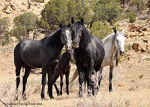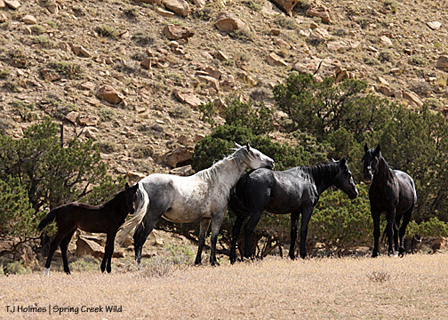 Left to right: Reya (4), Maiku (1), Puzzle (1) and Chipeta. They’re a long way from “home” territory. Chipeta is the dam of the foal that has now been adopted. We don’t know how they got separated. The helicopter pilot was excellent about not even targeting the horses we asked him not to. That’s why he left the bunch alone when he realized they were with the youngest foal. What a story that foal could tell … I’m not even sure who the horses were that were with Chipeta’s band when the pilot did see the group. So all the pintos (and their hangers-on) are accounted for except stallion Corazon.