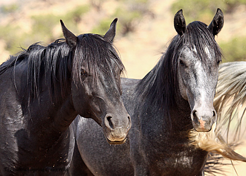 Tenaz and Corona. Tenaz was almost caught … Baylee was caught (she’s awaiting adoption – big, beautiful bay girl), and Storm gave observers a show when he galloped away right past them on the hill above the trapsite.