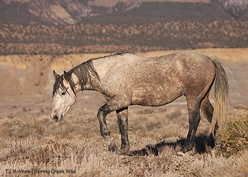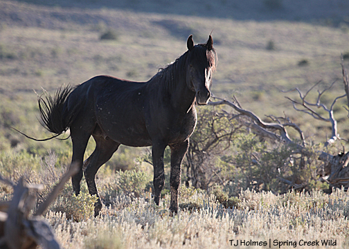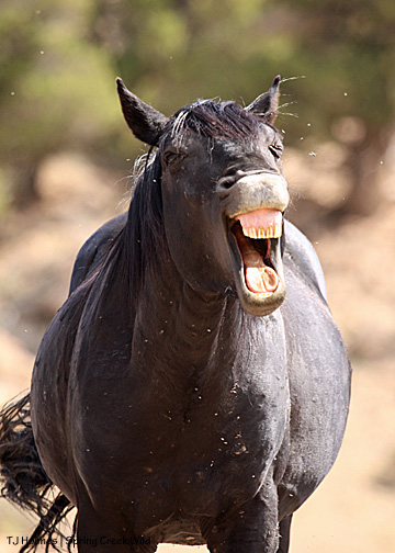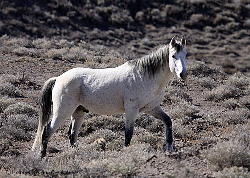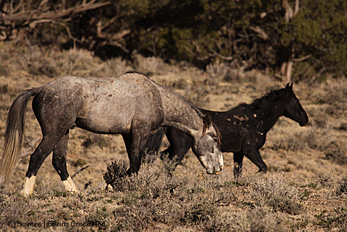 Storm’s band was brought to the trapsite during the roundup, but only Baylee was captured (she’s awaiting adoption now at Canon City). Storm galloped past observers on the hill to the northwest, and Tenaz hid on the backside of Filly Peak. The day after everything was done and everyone was gone, Tenaz showed up with Corona. Unfortunately for the youngster (he’s 1), Traveler made short work of that liaison, and now he has Corona (back – he stole her originally in the spring).
