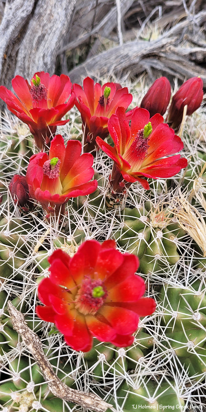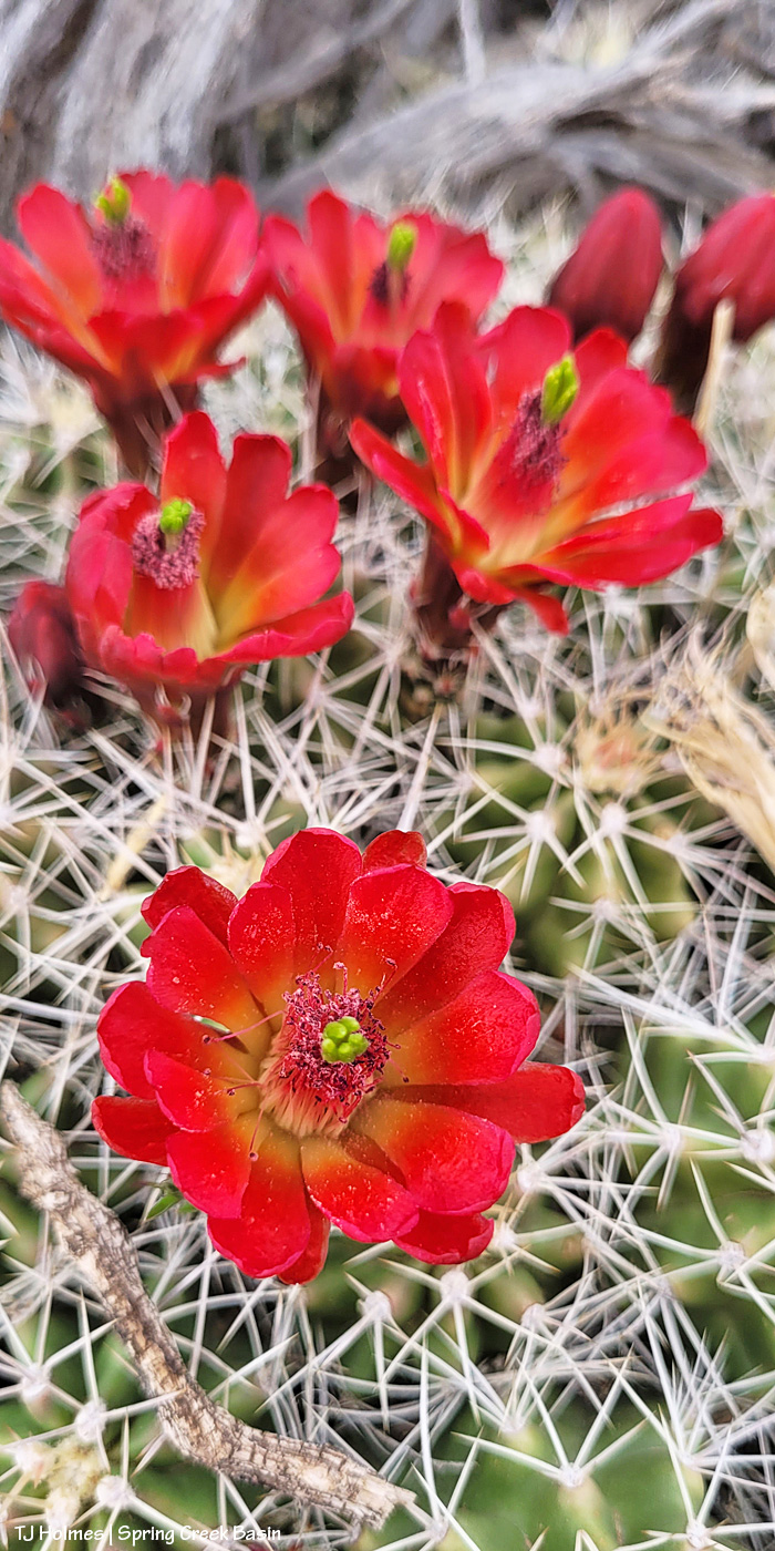 As widespread and gloriously blooming as the claret cup cacti are in Spring Creek Basin right now, you’d be surprised at how hard it is to get any in the same frame with any mustang as they graze peacefully in the open or on the treed slopes.