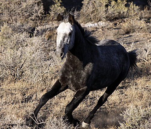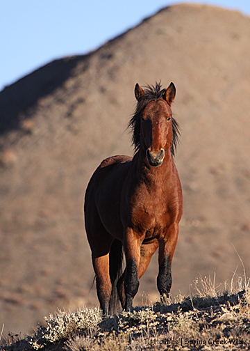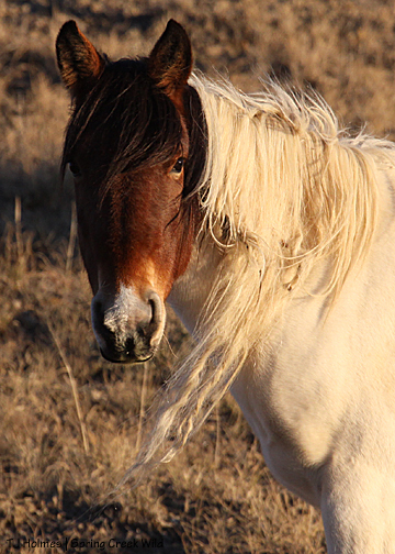Copper has been hanging out with the pintos for quite a while – since right after the roundup – but on that last hike, I found him separately. I had seen him from a distance and walked out, only to find no horses at all. But I found his tracks and followed them … Quite interesting to follow in his footsteps for that distance. He didn’t always pick the easiest path – though he did briefly pick up a trail – and he didn’t always go around vegetation but sometimes straight through it. And he went way out around an area … only to end up back very close to where I’d first seen him. Looking. I finally caught up to him, and he whinnied at me.