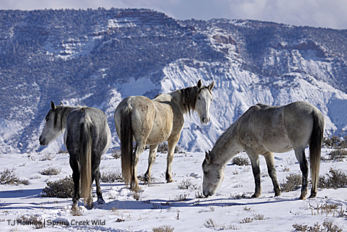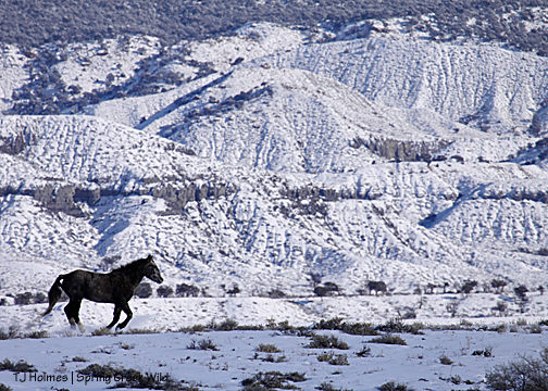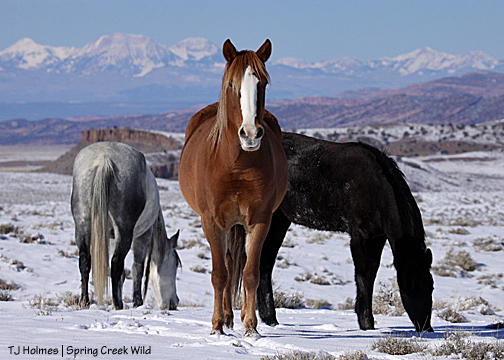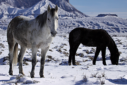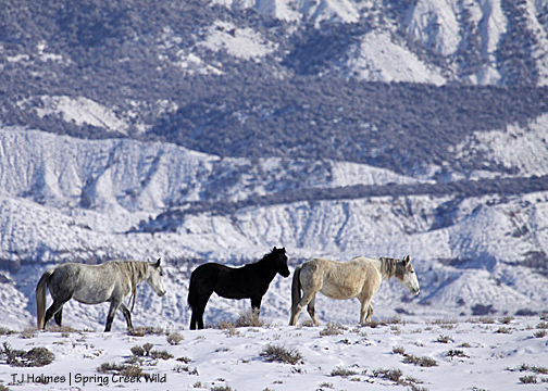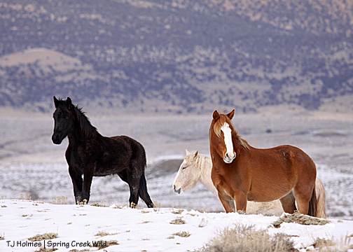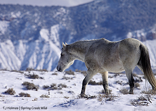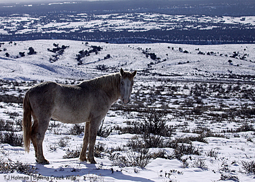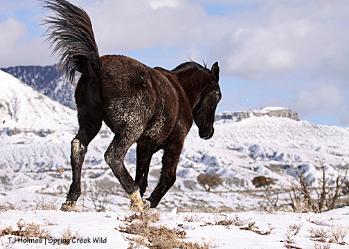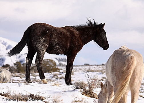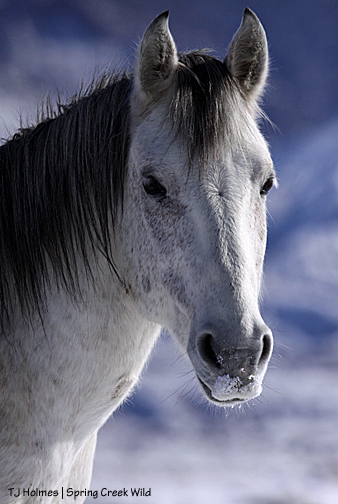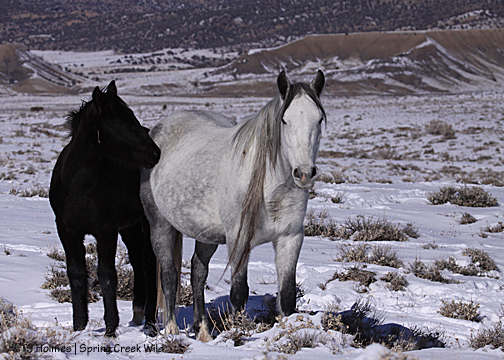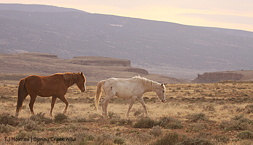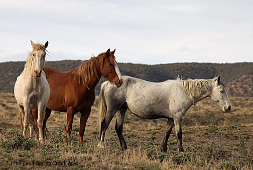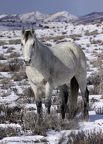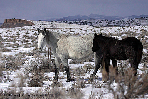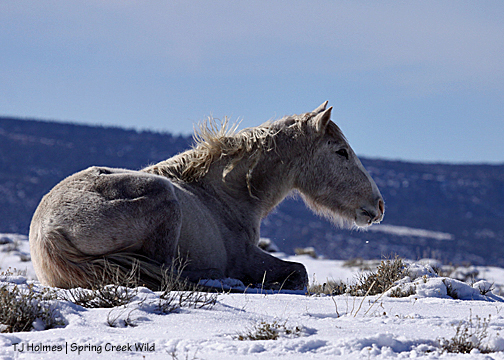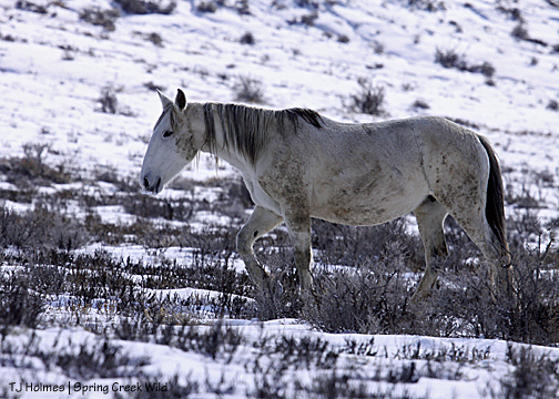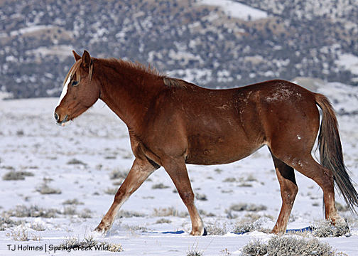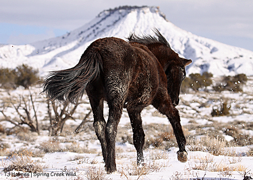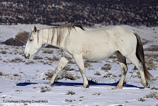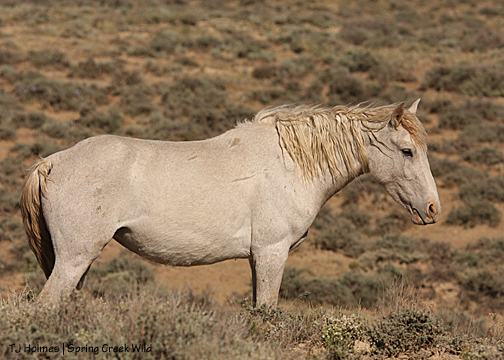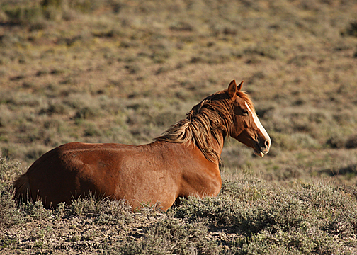 Corona is fairly small, even as mustangs go. The foal’s sire is Grey/Traveler, with whom she has been since last spring. I’ve gone back and forth all spring about whether I think she actually is pregnant. Some days she looks more pregnant than others. Her udder is fuller than normal, though, so I think she has a baby in the belly. Corona is out of Raven, from Sand Wash Basin, and by that range’s stunning stallion Corona – hence her name. (This is known from documentation by an HSUS employee during that time.) Raven, Kootenai and Mona came from Sand Wash Basin in 2008, part of an introduction to keep our Spring Creek Basin genetics healthy.