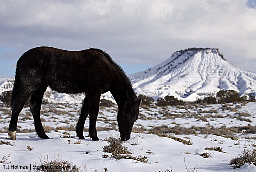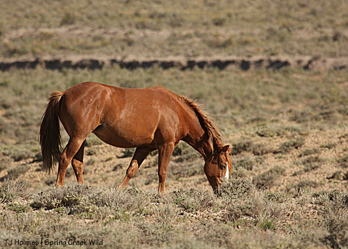 Gaia grazing. Her mama is the lovely Alegre; her sire is unknown (she was born in 2008, the year after the 2007 roundup). Her foal’s sire is Cinch.