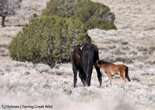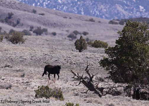 There was still a possibility we’d see the pintos up the next drainage … and as we proceeded down the road, I spotted a pinto I thought at first was Corazon. But when I looked through the binocs, I realized it was Bruiser! He’s still by himself … but Lady Luck was completely on our side, and the pinto band was nearby. He’s keeping his distance, but he’s also keeping an eye on them.