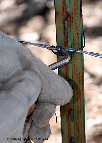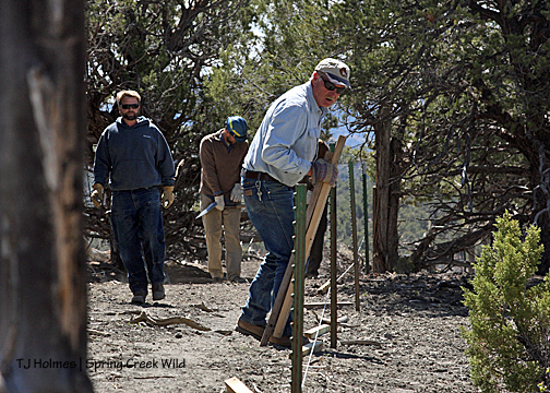 Ran new wire, four strands: Check. MK and Tom, both with San Juan Mountains Association, ran the last strand of wire from the padded tree to the H-brace while Grace, back right, helps channel the wire.