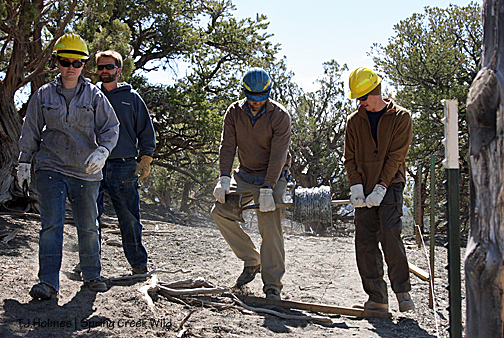 Dug post holes and built another H-brace: Check (oh yeah, and they carried these two thick, treated posts from the road just for this brace, at the top of the steep arroyo hill, to anchor the rest of the fence). Check, check! Here’s Chalen tightening the cross wires to strengthen the brace and Chris pounding in a spike (in a hole drilled earlier by Kevin) to secure the post to the cross piece.