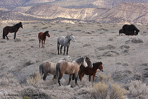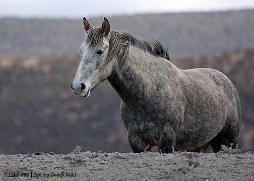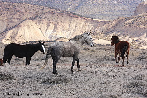 Some of the boys’ roughhousing brought them down into the arroyo and up the hill a bit, and Steeldust charged down in warning – you can maybe see a little of the dust obscuring the saltbush below him. I found it so interesting that he didn’t need to wade in – knew it was play – and he had his own role – protecting Alpha. What a dynamic this little band has. How long will it be before Storm leaves mama? Will Steeldust and Alpha and Butch and Luna stay together? Mahogany and Sundance and Aspen left … at whose instigation? Will Butch eventually challenge Steeldust for Alpha, too? Steeldust backed down to him last spring … but Butch was focused on Luna and never challenged for Alpha. And with Butch’s “must-be-at-her-side-always” style, how many mares does he think he can care for? I think Alpha will stay with Luna as long as possible.