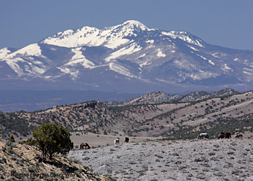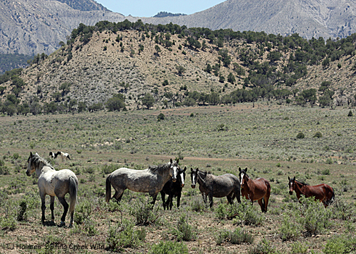 This was taken the next day and shows Twister, butt to the camera at left, with Hook’s band – that’s big grey Hook standing by Sable, heavy-pregnant Ember (due around early July), Hannah and Fierro. Pinon also is part of this band (he was off to the right, I think). In the background, Spook and Bruiser. A bit to the left were Seven’s, out as far as Spook and Bruiser but to the right were Bounce’s, and behind and leftish were Sundance and Aspen. Rarely are so many of our horses in the same general area except in the spring, when they’re back here with good forage and fairly good water. In fact, two of the remaining four ponds with water are back in this general area. Another reason to have good, scattered water sources – disperse the horses’ grazing.