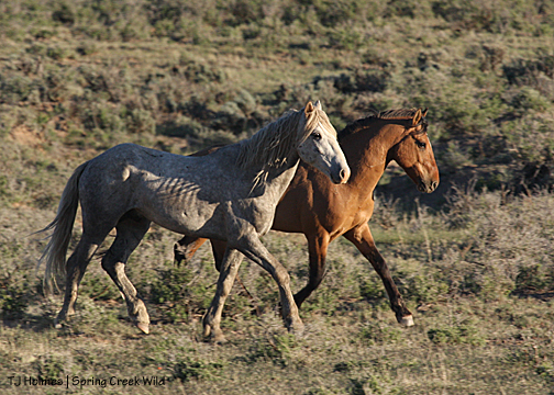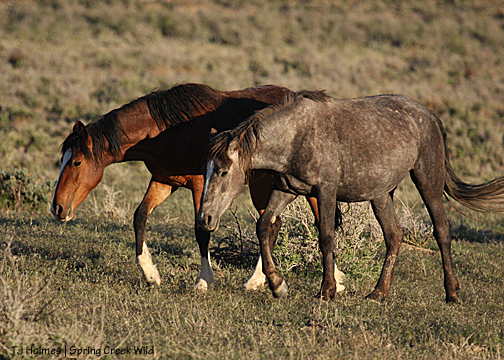 Ties of family are strong, blood or no. Liberty and her mother, Molly, spent time with Bounce’s band shortly before Molly died in the fall of 2009. Afterward, Liberty went back to the band … then ended up with Cinch in the fall of 2010. Gaia ended up with them over the winter (January 2011?). Gaia is 3 (Alegre’s daughter, Bounce’s stepdaughter), Liberty is 2 (Seven x Molly). It’s not a huge surprise these girls ended up back together. 🙂