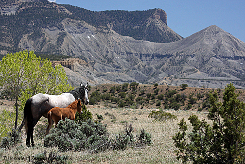 Luna and Alpha trying their best to catch some shut-eye with all the goings-on (across the arroyo to the left). This was just after Butch had rejoined Luna after his little foray with the boys. Luna looks decent for a girl who has had multiple foals in a row (this will be her fifth foal since I’ve known her (Kestrel, Ember, Hannah, Gideon). I’d love to give her a rest … She should stay, not only because of her outside genetics (she and two others came from Sand Wash Basin in 2001) but because of her wise alpha-mare status (like Alpha above her).