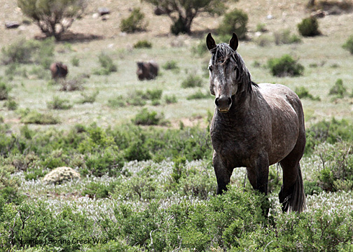 Didn’t take pix of Seven’s or Grey’s. Seven’s were very close to where I saw them last week. I just sat in the Jeep and watched them. Roja grazed and watched and watched and grazed for about 10 or 15 minutes, then oh-so-casually led her family away. She is so wary and so protective, and because I’ve witnessed them being chased (a couple of summers ago, after which I never saw Molly’s filly Starla again), I just don’t have much heart for even attempting to get too close for her comfort – which isn’t close at all.