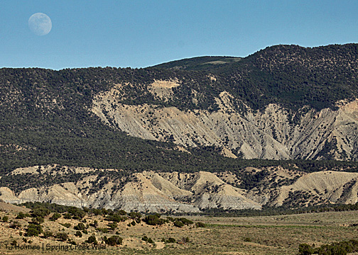 An example – this patch of sunlight illuminated the finger hill Bruiser, Twister and Cinch (reunited) were standing on while the ridge behind them stayed in shadow. They were looking down on Hollywood’s band, who eventually went north, while the boys moseyed down off the hill and across the arroyo and up onto the bench that carries the west-side loop road toward Round Top and points east.