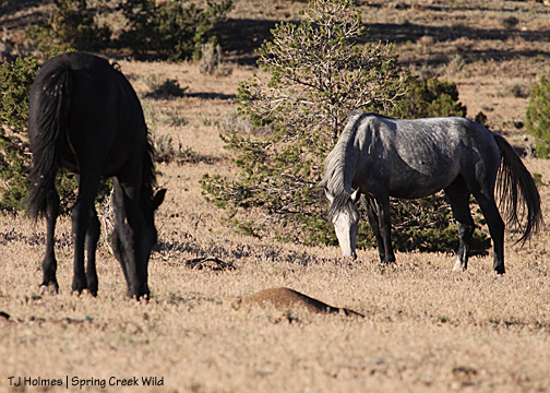 Comanche grazes by Kestrel as she stands over Winona. The other horses were never far away. I wonder whether Kestrel will continue to follow Mahogany or whether she and Comanche will eventually split off on their own.