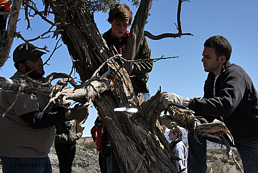 The shadows don’t allow for much detail in this shot, but this is the first H-brace the students built, using the tree as the anchor. Notice the extra “padding” around the tree.