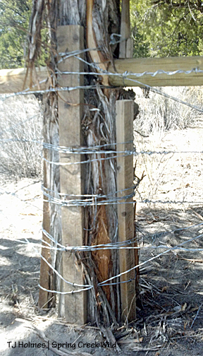 Here’s a closer view. The staves protect the tree from wire biting into the bark – thank you (again), Tom Kelly, Forest Service fence-builder extraordinaire!
