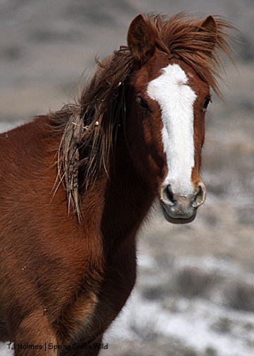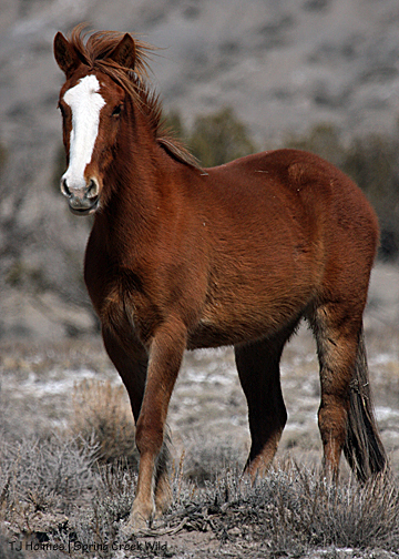 Kestrel’s was the first new foal I saw yesterday, but her group wasn’t the first of the day. Pinon was leading Ember and Hannah along a ridge down by Spring Creek … and Hook was nowhere to be seen. I couldn’t believe he’d gone off and left them, but that’s exactly what he did. Where did I find him? Running circles around Kestrel and filly, fended off by Comanche, with Sundance, Mahogany (close but not yet), Sable, Mouse and Aspen right nearby. What a goofy boy. Like he has any chance of getting one little mare of two mares guarded by four stallions! This morning, he had reunited with his flock, and all was well.