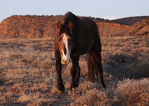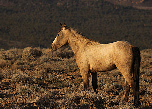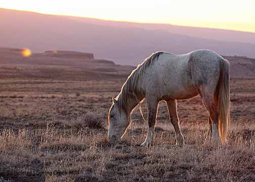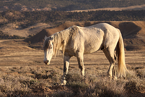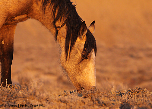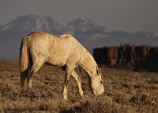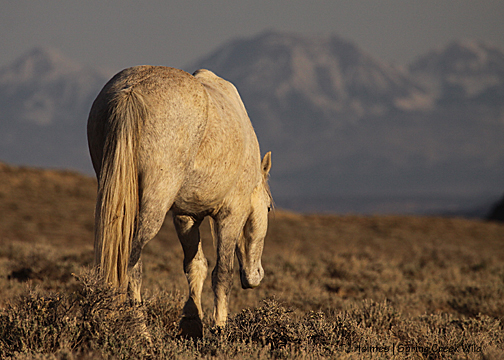 Gorgeous stallion, perfect backdrop … and he paused in his grazing only to amble to the next tasty tidbit.