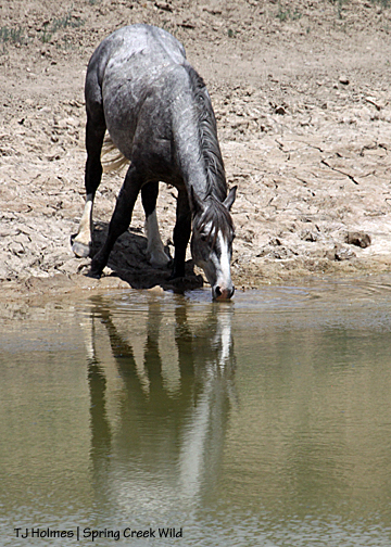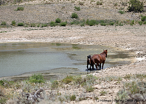 Zoomed out to show more of the pond. As part of my documentation of the horses these last few years, I keep track of how much water the ponds have and when they go dry – and when they fill back up with the summer rains. Now that we have a herd manager who is interested, I share that information with him. The pond just north of here – the east-pocket pond – went dry just a week or so ago, just a few days after our herd manager saw it with very shallow water.