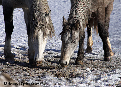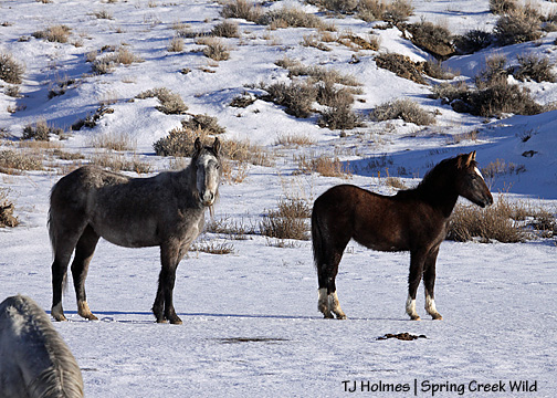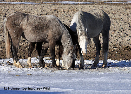 So … Iya, front/left, is a yearling, and Two Boots (named with a nod to Pryor stallion Two Boots, by the way) is her 2-year-old “big” sister. They don’t look much alike, besides the size comparison, do they? But as far as I know (???), they have the same sire, a grey stallion I called Junior who was gathered and removed in 2007.