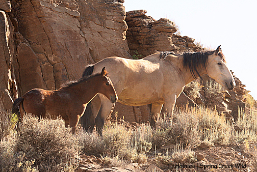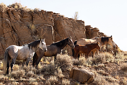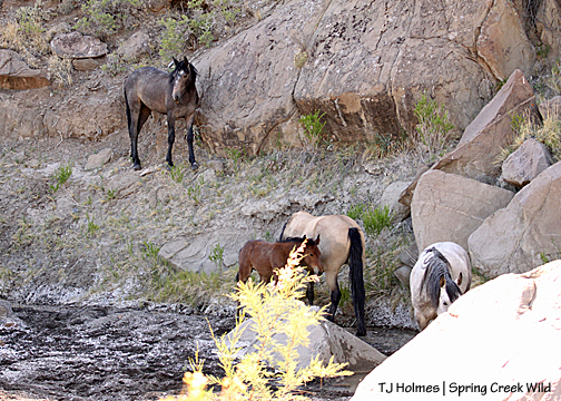 Comanche’s band sticks pretty close to Hollywood’s band. The stallions zealously guard their mares – and if the mares get out of line, they send them back! Interesting to watch. Duke and Seven also are with the band most of the time, and this day, Kreacher’s little band (he got Roja and Killian) also was nearby and drank from a different part of the canyon.
