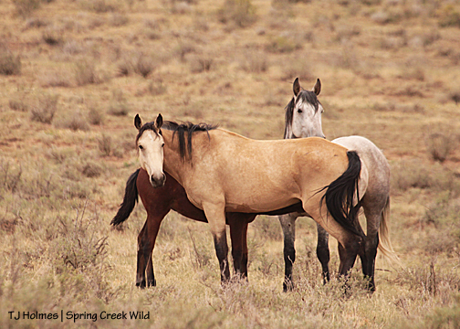 Mama Kestrel and her girls Madison, 2 1/2 months old, and Juniper, yearling. Her first daughter, Winona, is buckskin. Juni is going grey like her daddy, Comanche, and baby Madi is bay like … ? Her daddy also is Comanche; his background unknown.
