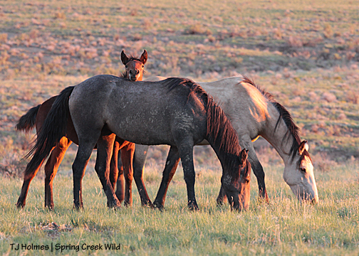 Sweet baby Madison peeks over sister Juniper’s back while grazing with mama Kestrel at sunset.