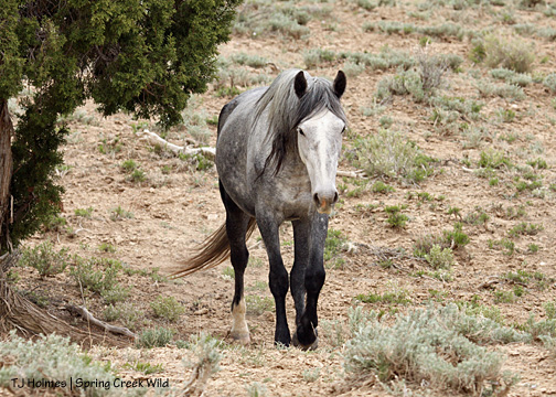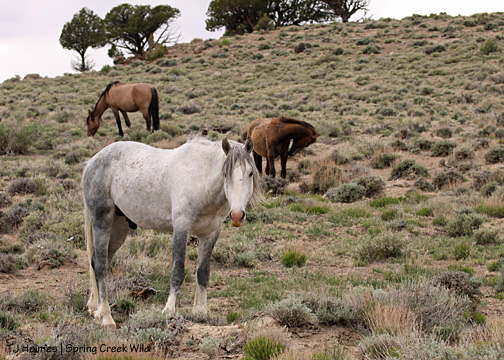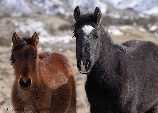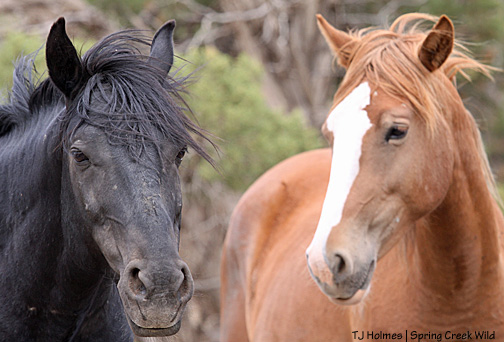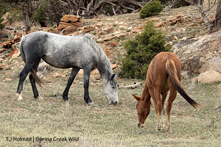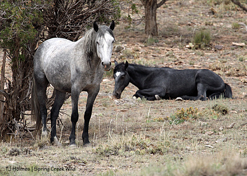 Steeldust’s band was farther up the hill across a little drainage (at the top of this hill, the land falls off in a rugged cliff to the “canyon confluence” behind Wildcat Spring). I went to visit with them … and Bounce decided that was a good idea, too. He played with Storm for a few minutes until Steeldust chased him away. More to come.