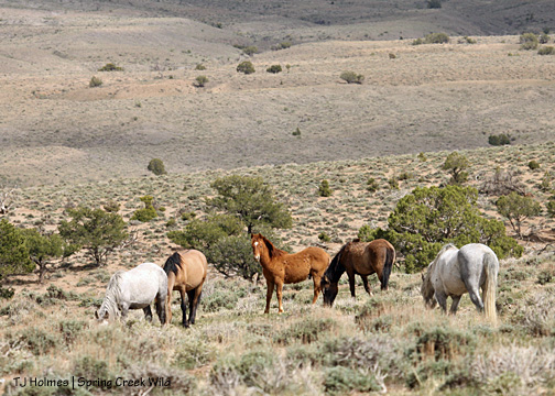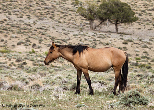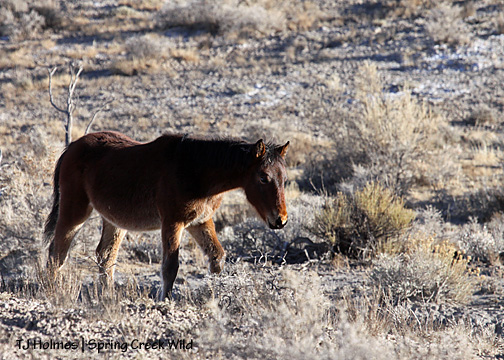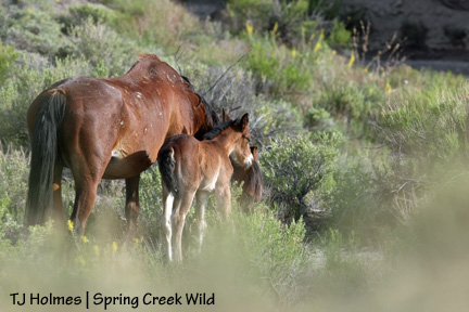 Kestrel’s was the first new foal I saw yesterday, but her group wasn’t the first of the day. Pinon was leading Ember and Hannah along a ridge down by Spring Creek … and Hook was nowhere to be seen. I couldn’t believe he’d gone off and left them, but that’s exactly what he did. Where did I find him? Running circles around Kestrel and filly, fended off by Comanche, with Sundance, Mahogany (close but not yet), Sable, Mouse and Aspen right nearby. What a goofy boy. Like he has any chance of getting one little mare of two mares guarded by four stallions! This morning, he had reunited with his flock, and all was well.