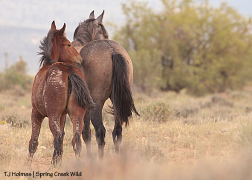 Sweet baby Madison peeks over sister Juniper’s back while grazing with mama Kestrel at sunset.