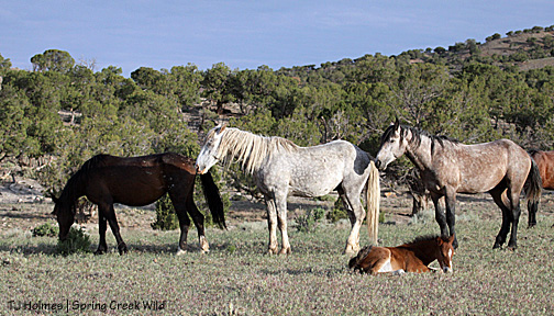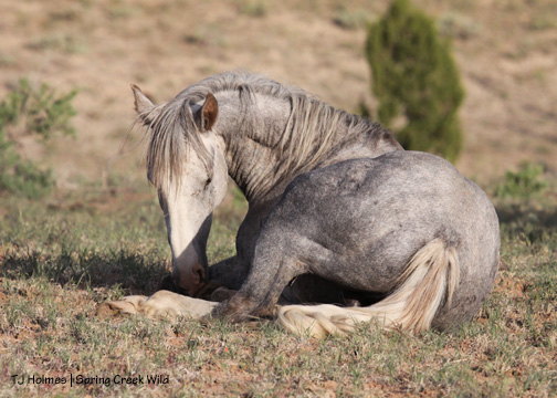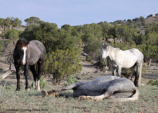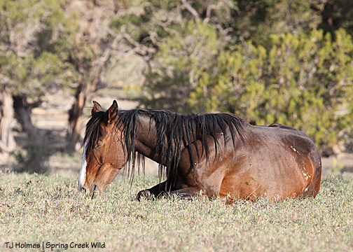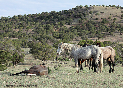 Comfortable enough to stretch full out with the boys standing guard over her. Interestingly, I’m sure Sundance is the youngest of these stallions; I think Mouse and Aspen are roughly the same age. Sundance grew up with “rank” in the band, though, while Mouse and Aspen came in as bachelors.