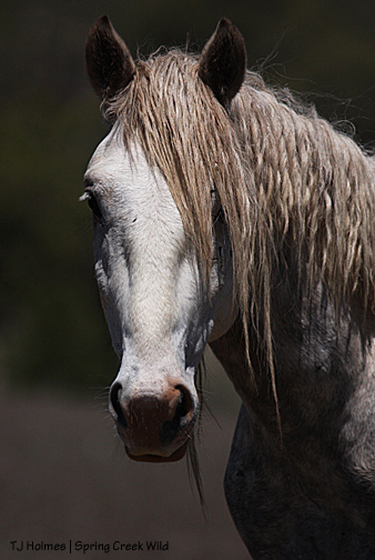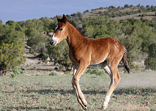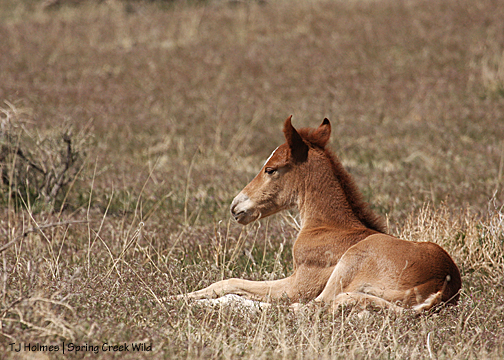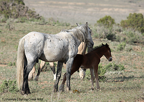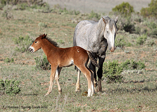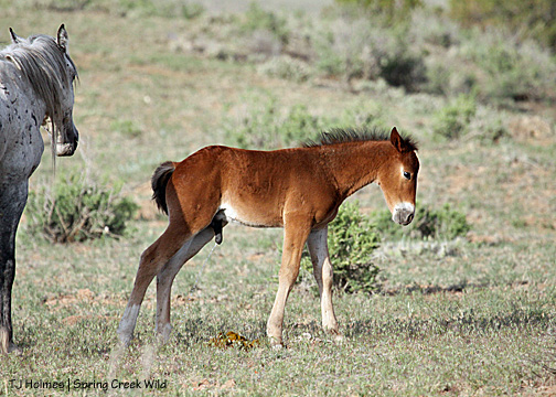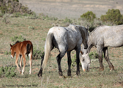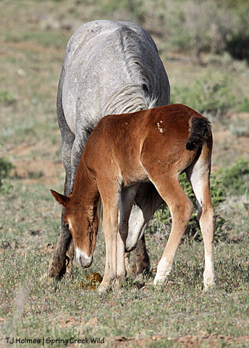 Eliana is the daughter of Mahogany and Sundance. When the fracturing of Steeldust’s band started in earnest last spring, Mahogany ended up with Sundance – and bachelor Aspen. Just a day or two after Eliana was born – and the day after I first saw her – Aspen finally succeeded in stealing her from Sundance. Among the meanings of her name is “daughter of the sun” – and so she is, not to be forgotten, though Aspen now has her and Mahogany.