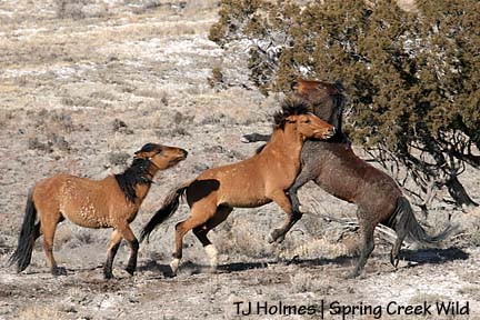 The key component in this photo is Jif, at left. Hollywood and Mesa were just doing a lot of sniffing and squealing – even posturing, but not even any striking – until Jif moseyed up and aggravated the situation. Then Hollywood lunged at Mesa in a full-on body slam! Mesa got the message and backed off – for a while.