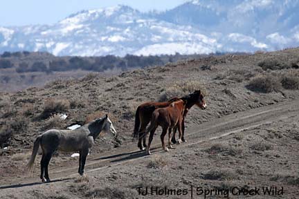 They immediately left when they saw me. They came up to the road that runs down to Round Top (before the intersection to go around through the northeastern section of the herd area), then trotted on down the road toward RT. Believing at least Roja to be pregnant, I figured I had no choice but to park where I was and wait for them to get to what they considered a safe distance.
